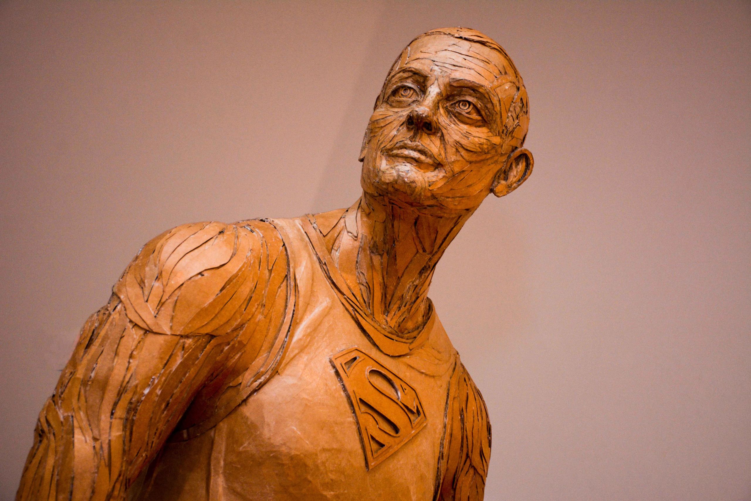 Walking into the gallery space at Asia House in London, you're greeted by a sculpture of Superman on prosthetic legs. Neon lights shine behind you, spelling out 'Tragic' and 'Brave' while a sound installation talks you through a dystopian future talent show where augmented voices are disqualified.